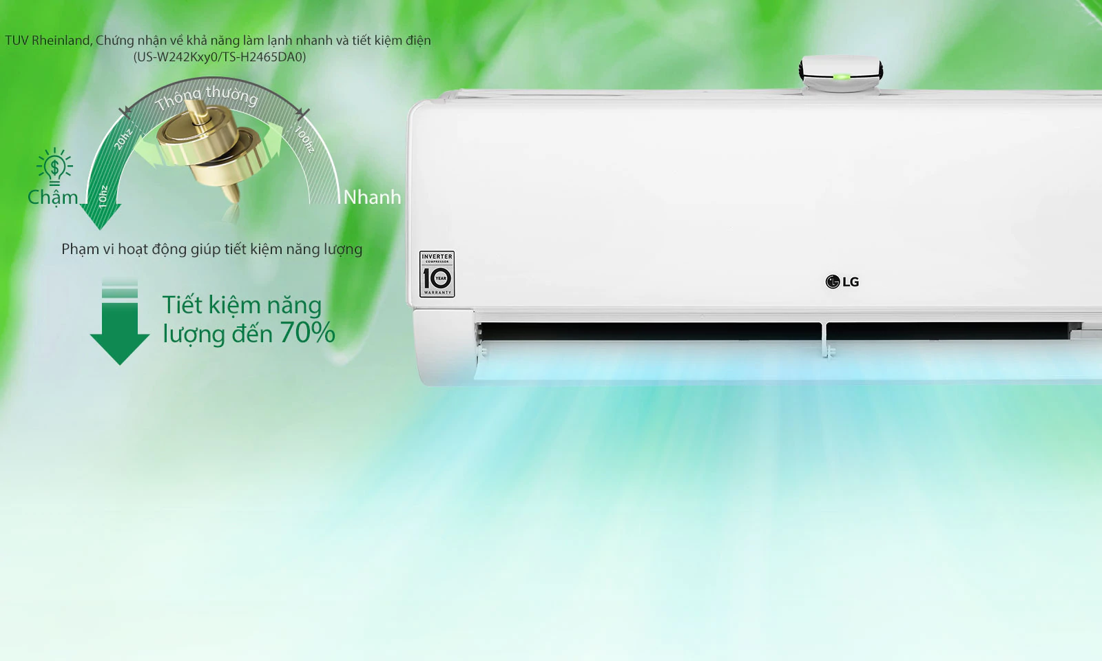 Điều LG DUALCOOL còn mang đến khả năng làm lạnh nhanh hơn tới 40% so với điều hòa thông thường. Nhờ hiệu suất mạnh mẽ của máy nén "kép" DUAL Inverter được tích hợp đến 2 motor nén đặt lệch pha giúp máy nén có t hể hoạt động ổn định ở tốc độ cao hơn.