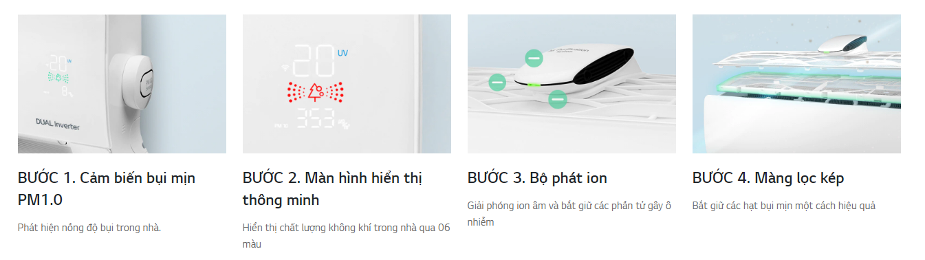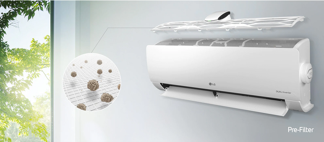 Hệ thống lọc của LG được thiết kế để bắt giữ các hạt bụi có kích thước trên 10μm cũng như các chất có khả năng gây dị ứng trong không khí như mạt bụi giúp mang đến một môi trường trong lành hơn.