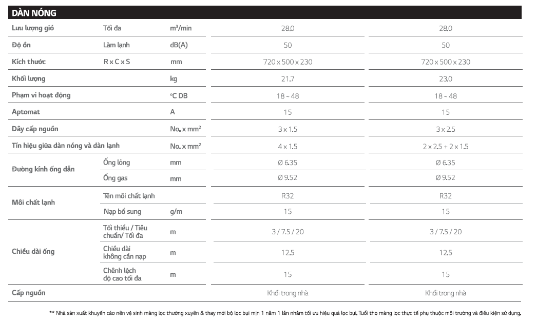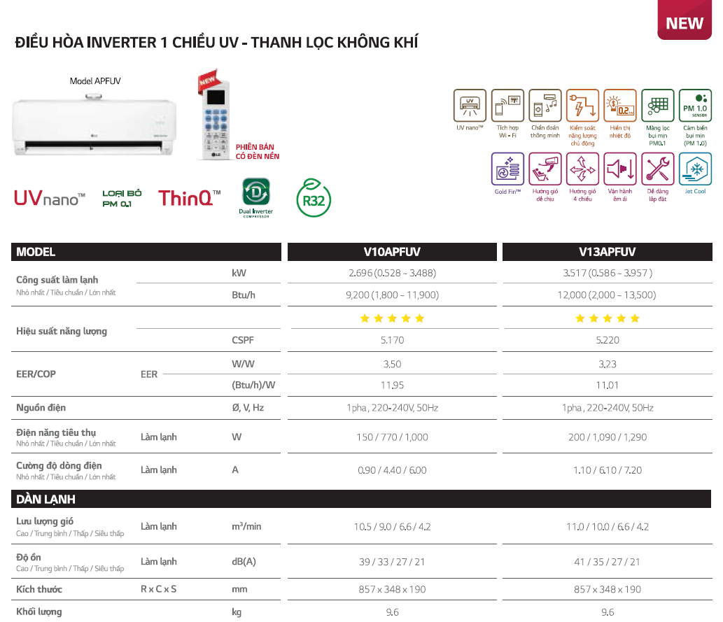 THÔNG SỐ KỸ THUẬT MÁY LẠNH TREO TƯỜNG LG INVERTER V13APFUV (1.5HP)