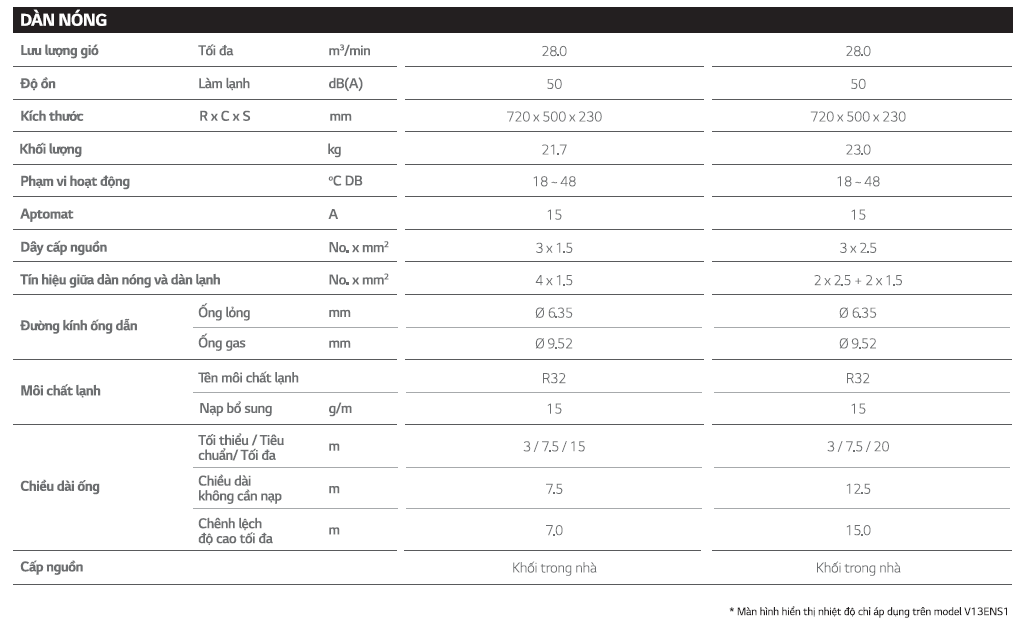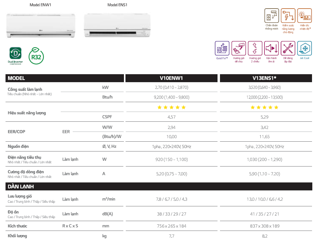 THÔNG SỐ KỸ THUẬT MÁY LẠNH TREO TƯỜNG LG INVERTER V13ENS1 (1.5HP)