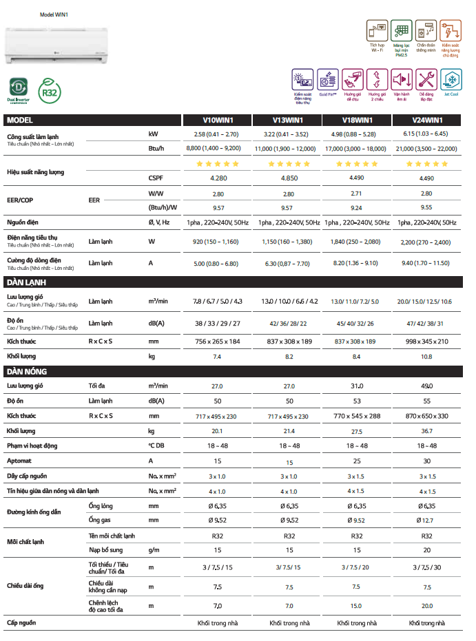 THÔNG SỐ KỸ THUẬT MÁY LẠNH TREO TƯỜNG LG INVERTER V10WIN1 (1.0HP)