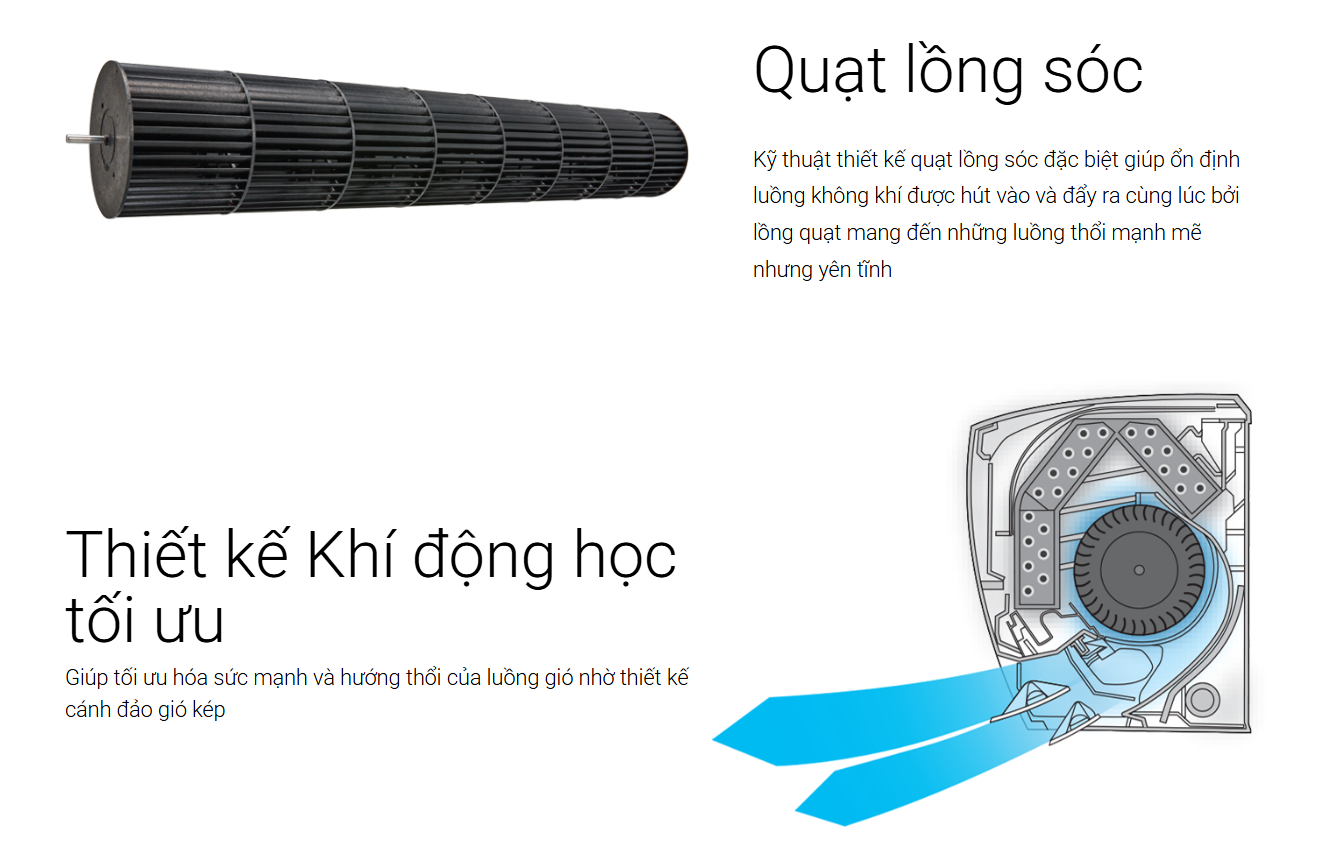 Độ ồn khi hoạt động của dàn lạnh chỉ dao động 21-43dB, độ ồn dàn nóng 50 dB vói quạt lồng sóc cải tiến và thiết kế tối ưu khí động học