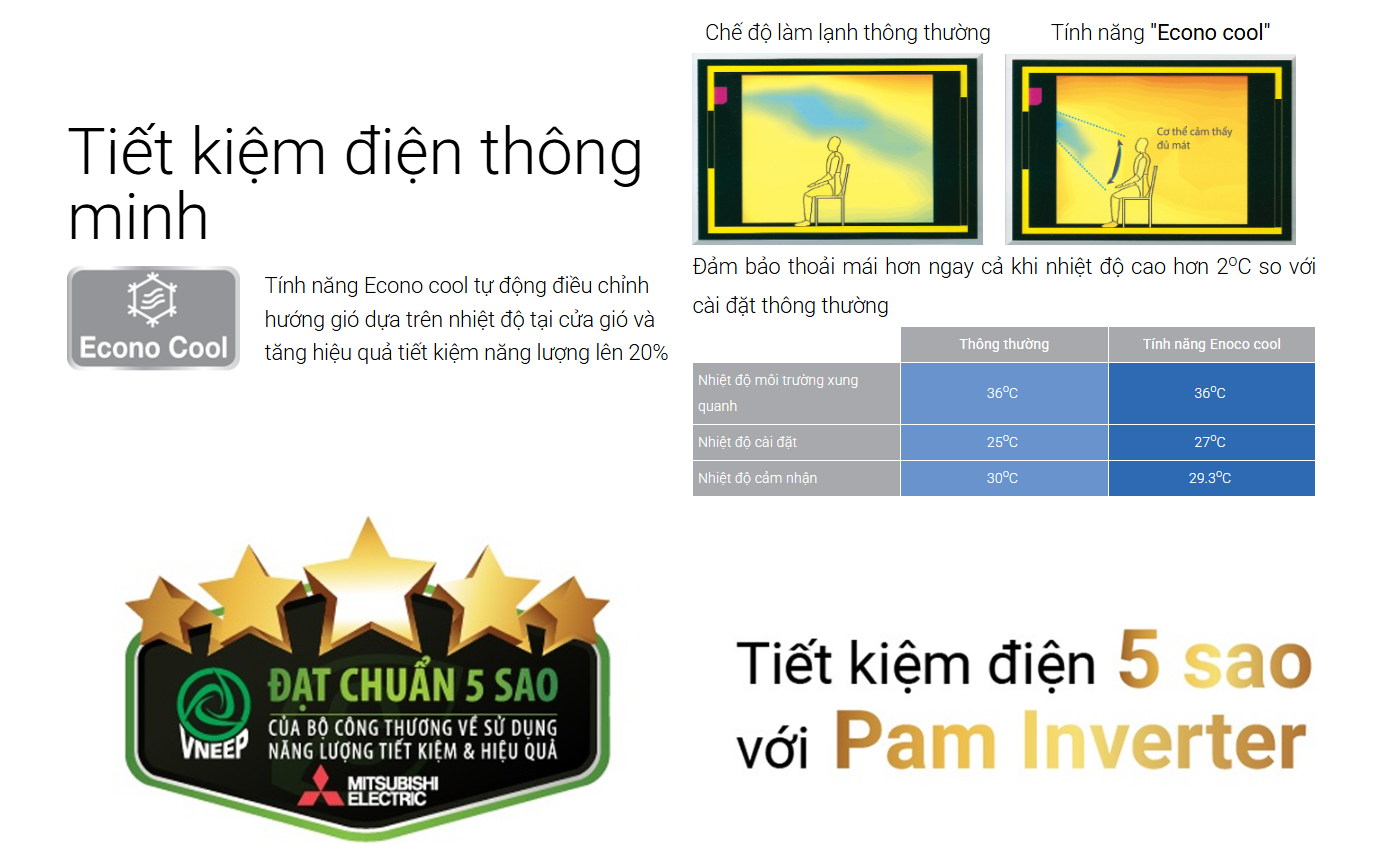 Thoải mái hơn, tiết kiệm điện hơn 20% với Econo Cool, máy lạnh Mitsubishi Electric đạt chuẩn năng lượng 5 sao mới nhất hiện nay.