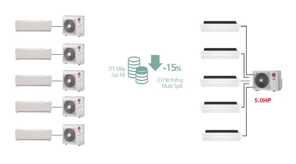 Bạn có biết giá của 5 máy cục bộ đắt hơn 1 hệ thống Multi Split? So với giá máy cục bộ, việc sử dụng hệ thống Multi Split sẽ giúp tiết kiệm đến 15% chi phí. Chỉ phải lắp đặt 1 dàn nóng giảm lượng nhiệt tích tụ, tạo môi trường thuận lợi cho hệ thống trao đổi nhiệt, thải không khí nóng từ phòng ra môi trường một cách dễ dàng, đảm bảo hiệu suất hoạt động.