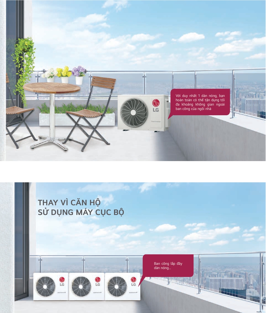 Chung cư và nhà ở cao tầng đang là xu hướng của xã hội, một căn hộ cao tầng với thiết kế sang trọng, an ninh nghiêm ngặt ngày càng là sự lựa chọn của nhiều người trẻ. Tuy vậy, khi lắp đặt hệ thống điều hòa không khí, khi phải lắp đặt đến 3-4 dàn nóng tập trung tại ban công / lô gia khiến nhiệt tỏa ra từ dàn nóng không được trao đổi nhiệt, chiếm diện tích sinh hoạt. Máy lạnh MULTI là giải pháp số 1 cho trường hợp này. Và máy lạnh MULTI LG là một sự lựa chọn hoàn hảo cho gia chủ. Không chỉ tiết kiệm không gian, mà còn đem lại sự linh hoạt cho thiết kế khi không phải bó buộc với dàn lạnh loại treo tường nữa mà có thể tùy chọn loại âm trần cassette 1 hướng thổi hoặc giấu trần nối ống gió.