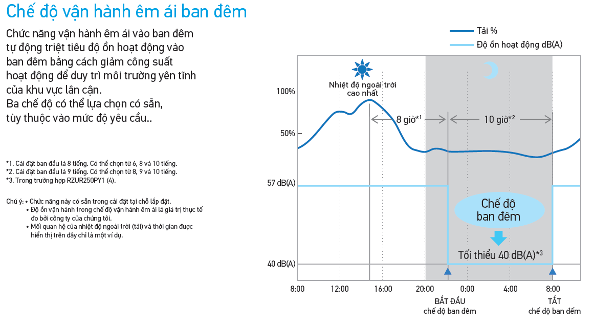 Chức năng vận hành êm ái vào ban đêm tự động triệt tiêu độ ồn hoạt động vào ban đêm bằng cách giảm công suất hoạt động để duy trì môi trường yên tĩnh của khu vực lân cân.