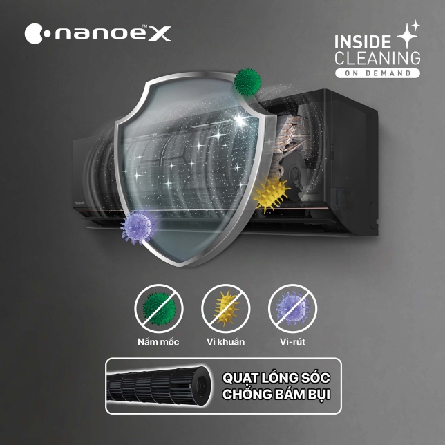 Tính năng Inside Cleaning loại bỏ độ ẩm và giải phóng các hạt Nanoe X làm sạch nấm mốc, vi khuẩn, virus .... bám trên dàn lạnh sau một thời gian sử dụng. Kích hoạt dễ dàng chỉ bằng cách ấn giữ nút Nanoe trên điều khiển
