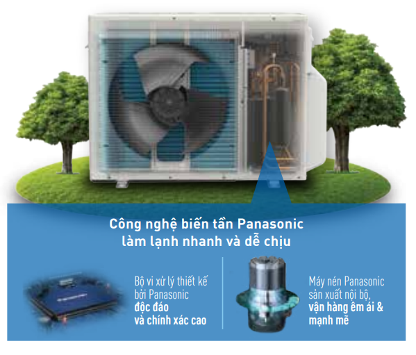 Công nghệ Inverter của Panasonic sử dụng bộ vi xử lý kết hợp với máy nén kiểm soát nhiệt độ chính xác, tiếng ồn thấp, hiệu suất làm lạnh tốt hơn mang lại không gian mát lạnh thoải mái nhưng vẫn tiết kiệm điện, bảo vệ môi trường.