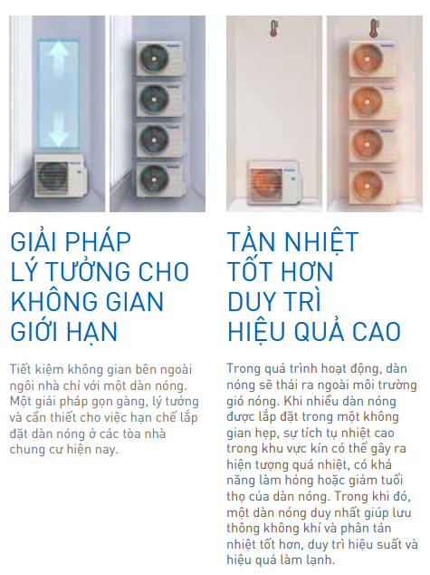 Với việc người dân ngày càng tiếp cận đến những căn hộ chung cư, nhà ở xã hội, ... ngày càng nhiều. Điểm chung của những nơi này là thiếu hụt không gian ngoài trời vì phải tối ưu hoàn toàn diện tích sống bên trong, do đó không gian để lắp đặt từ 2 dàn nóng trở nên khó khăn không chỉ về mặt kĩ thuật mà còn là hiệu suất làm việc của điều hòa.