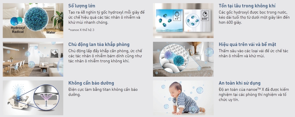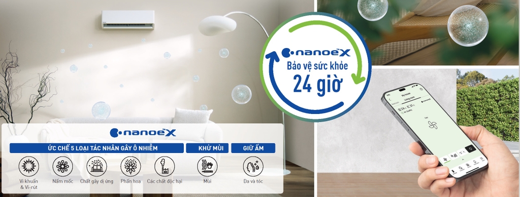 Công nghệ độc quyền NanoeX lọc khí, diệt khuẩn đến 99%, loại bỏ mọi tác nhân gây các bệnh về hô hấp. Bộ phát NanoeX hoạt động độc lập, có thể lọc khí ngay cả khi máy lạnh dừng hoạt động, thao tác đơn giản chỉ cần nhấn nút "Nanoe X" trên Remote.