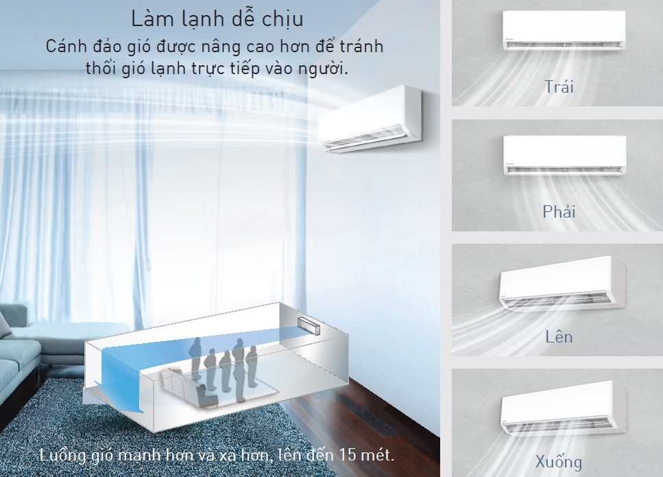 Thổi gió xa đến 15m, cánh đảo gió hướng khí lạnh lên trên tránh gió buốt thổi trực tiếp vào người. Đảo gió 4 chiều linh hoạt tùy chỉnh hướng gió theo ý muốn.