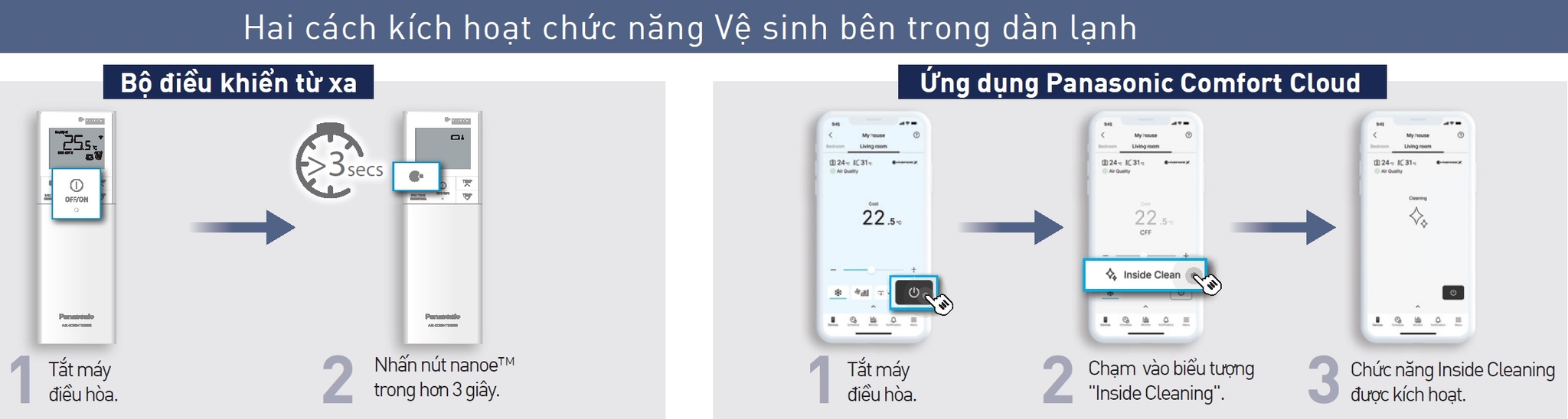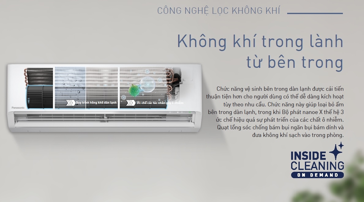 Bụi bẩn, vi khuẩn tích tụ trên dàn lâu ngày hòa lẫn vào trong không khí không tốt cho sức khỏe, máy lạnh cao cấp Panasonic cung cấp tính năng tự làm sạch dàn lạnh, dễ dàng kích hoạt.