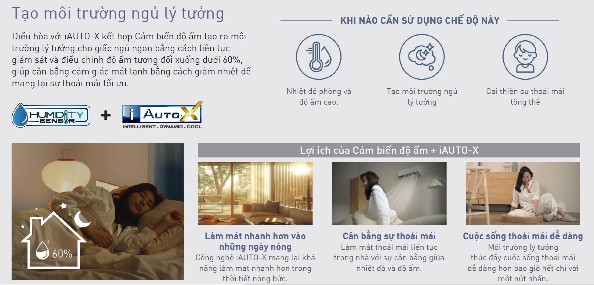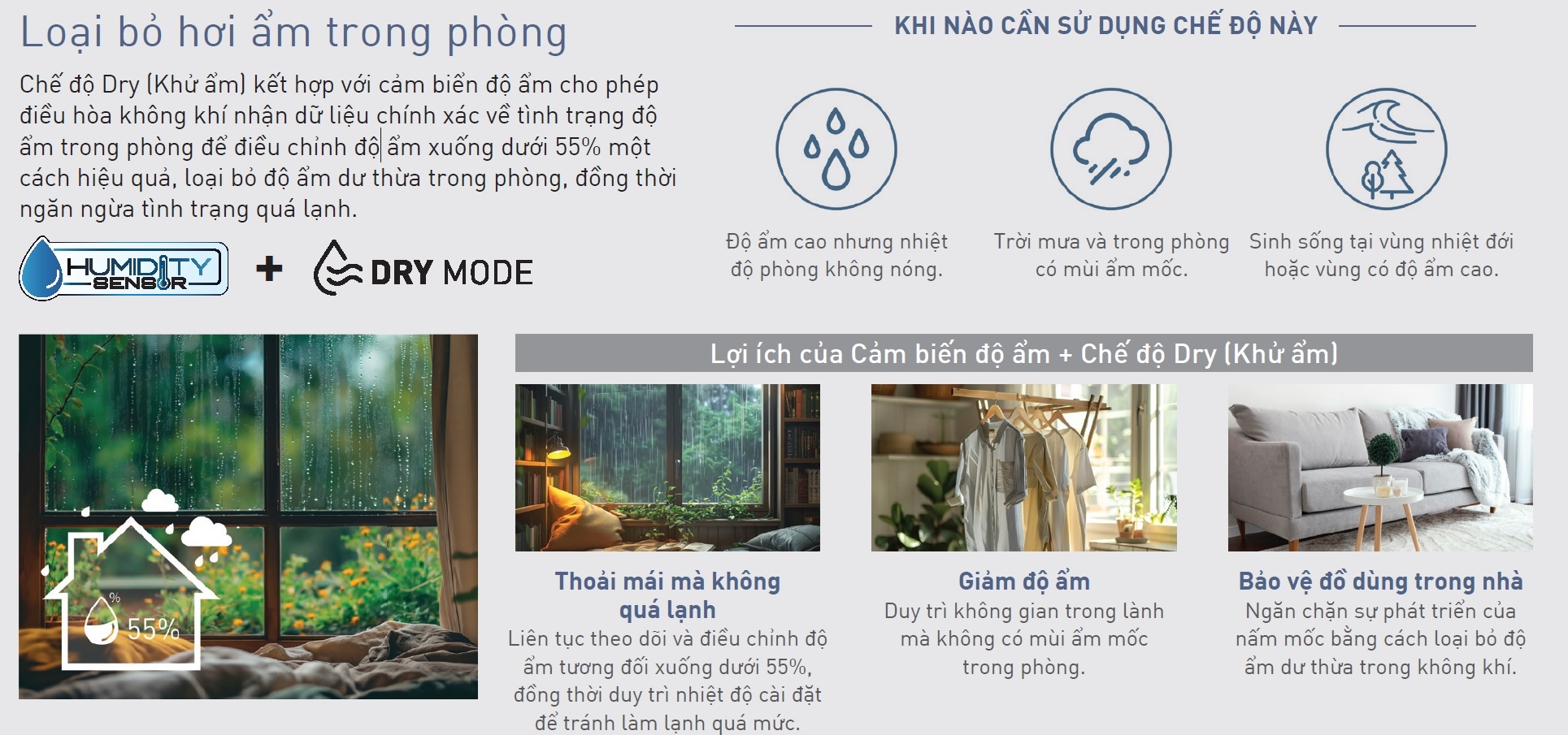 Duy trì độ ẩm trong phòng ở mức thích hợp, không để độ ẩm quá cao hay quá thấp ảnh hưởng sức khỏe và sinh hoạt. Kết hợp với tính năng Dry ( Khử Ẩm ) và iAuto-X (Làm lạnh nhanh) thoải mái mát lạnh hết cỡ không lo nóng bức, mệt mỏi.