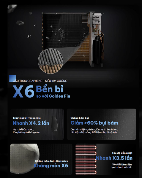 Với cấu trúc Graphene - Siêu kim cương bền bỉ gấp 6 lần so với Golden Fin. Hạn chế bám nước, giảm ăn mòn. Chống bám bụi, tiết kiệm điện và làm lạnh siêu tốc. Đúng như tên gọi KIm Cương Đen, máy lạnh Gree có độ bền vượt trội, chịu được điều kiện thời tiết khắc nghiệt, hiệu suất làm lạnh cao, chống chọi lại các tác nhân ăn mòn.