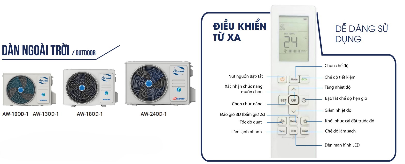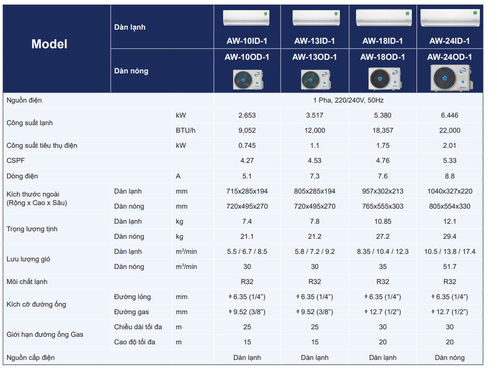 THÔNG SỐ KỸ THUẬT MÁY LẠNH TREO TƯỜNG INVERTER AIRWELL AW-24ID-1/AW-24OD-1 (2.5HP)