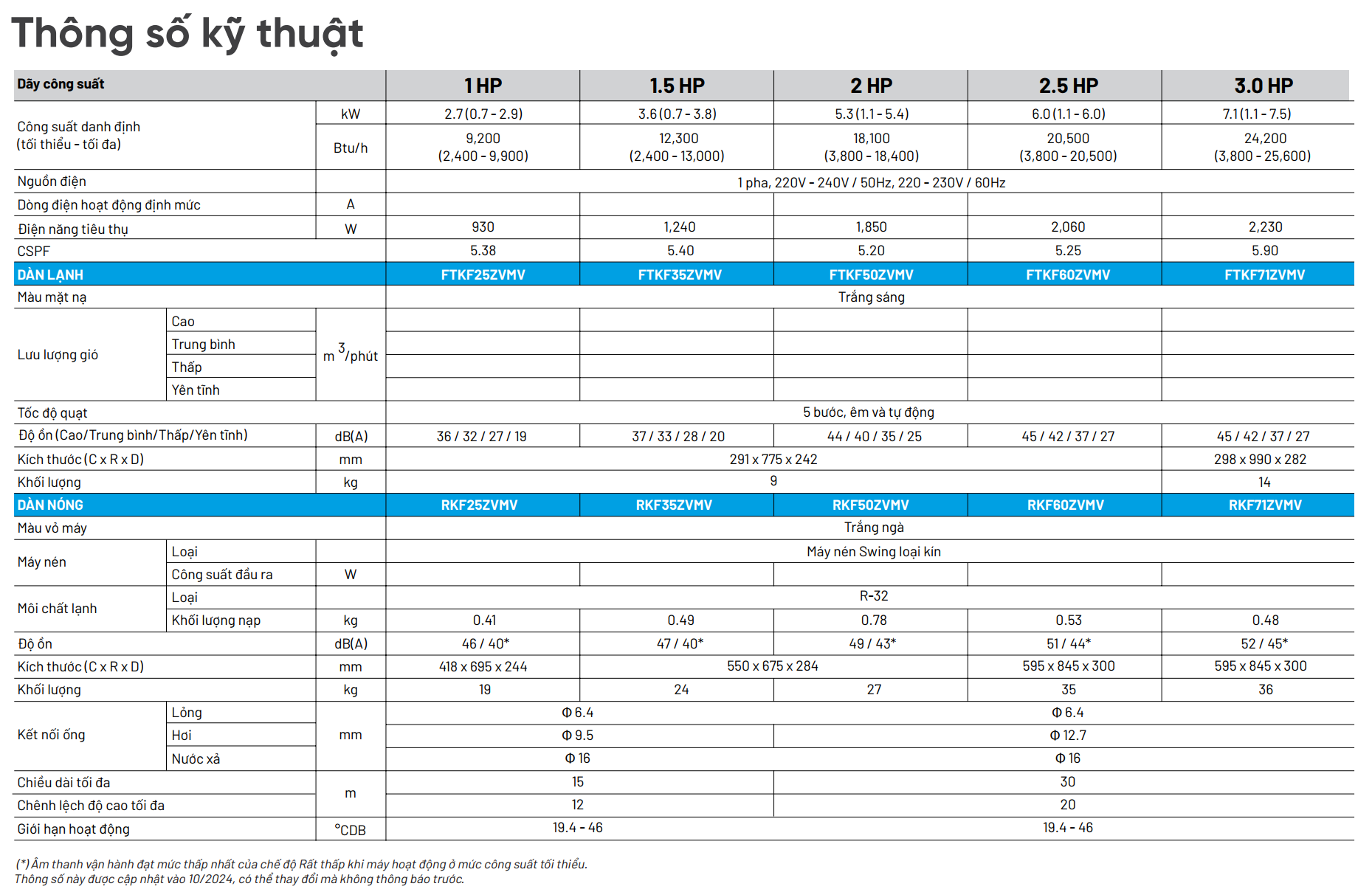 THÔNG SỐ KỸ THUẬT MÁY LẠNH TREO TƯỜNG INVERTER DAIKIN FTKF25ZVMV