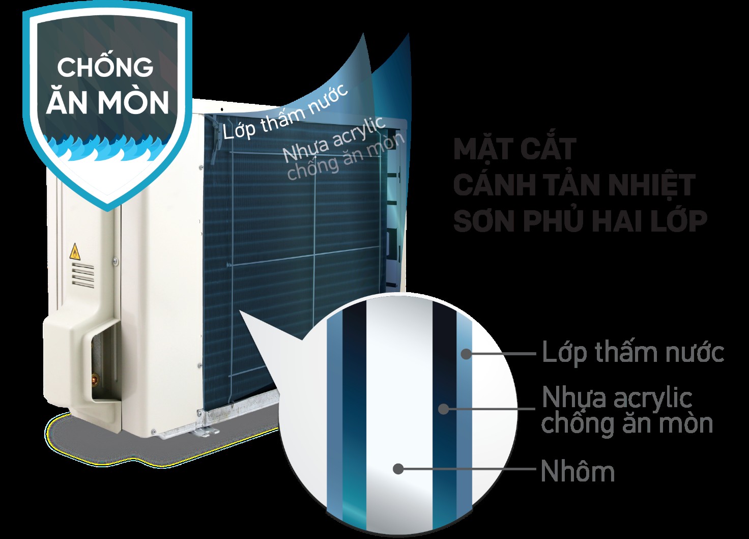 Bất chấp các tác nhân từ bên ngoài như nắng mưa, bụi, sương muối, nồm ẩm,… cánh dàn tản nhiệt sẽ không bị ăn mòn theo thời gian nhờ 2 lớp phủ tĩnh điện. Dù là ở ven biển, đồng bằng, núi cao hay thành thị, điều hòa Daikin bền vững cùng năm tháng.