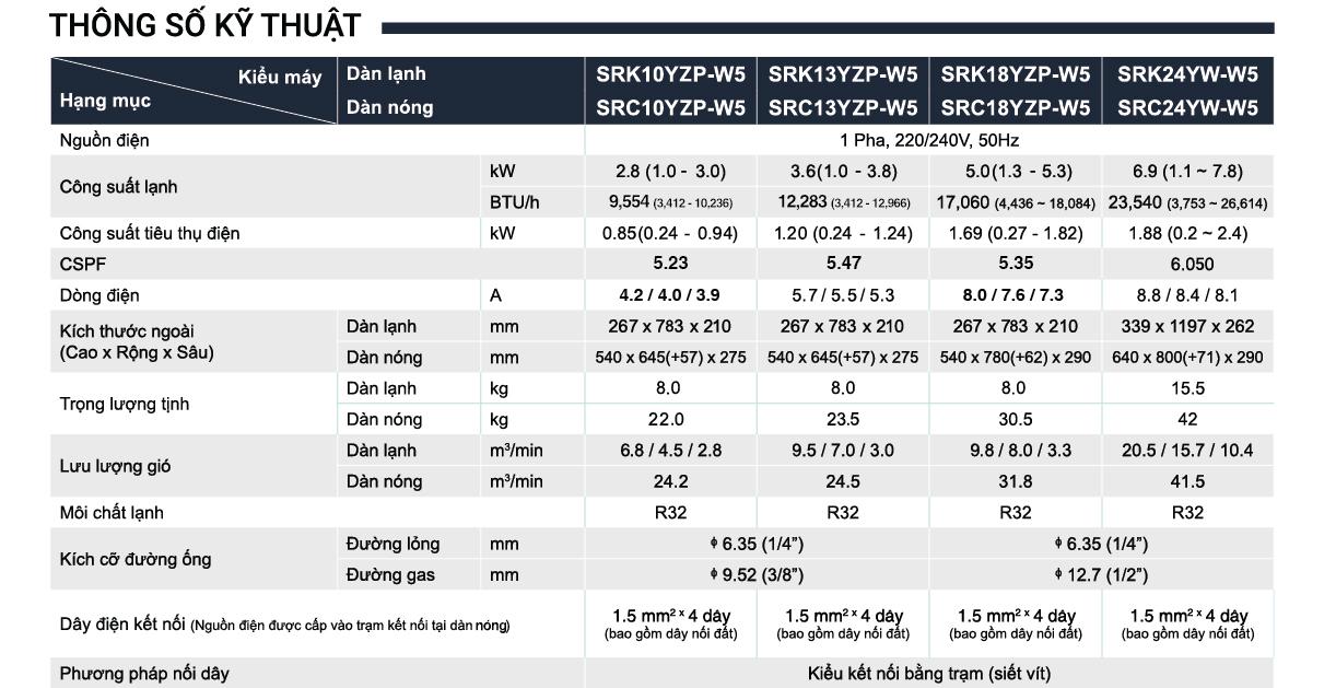 THÔNG SỐ KỸ THUẬT MÁY LẠNH TREO TƯỜNG INVERTER MITSUBISHI HEAVY SRK/SRC_YZP-W5