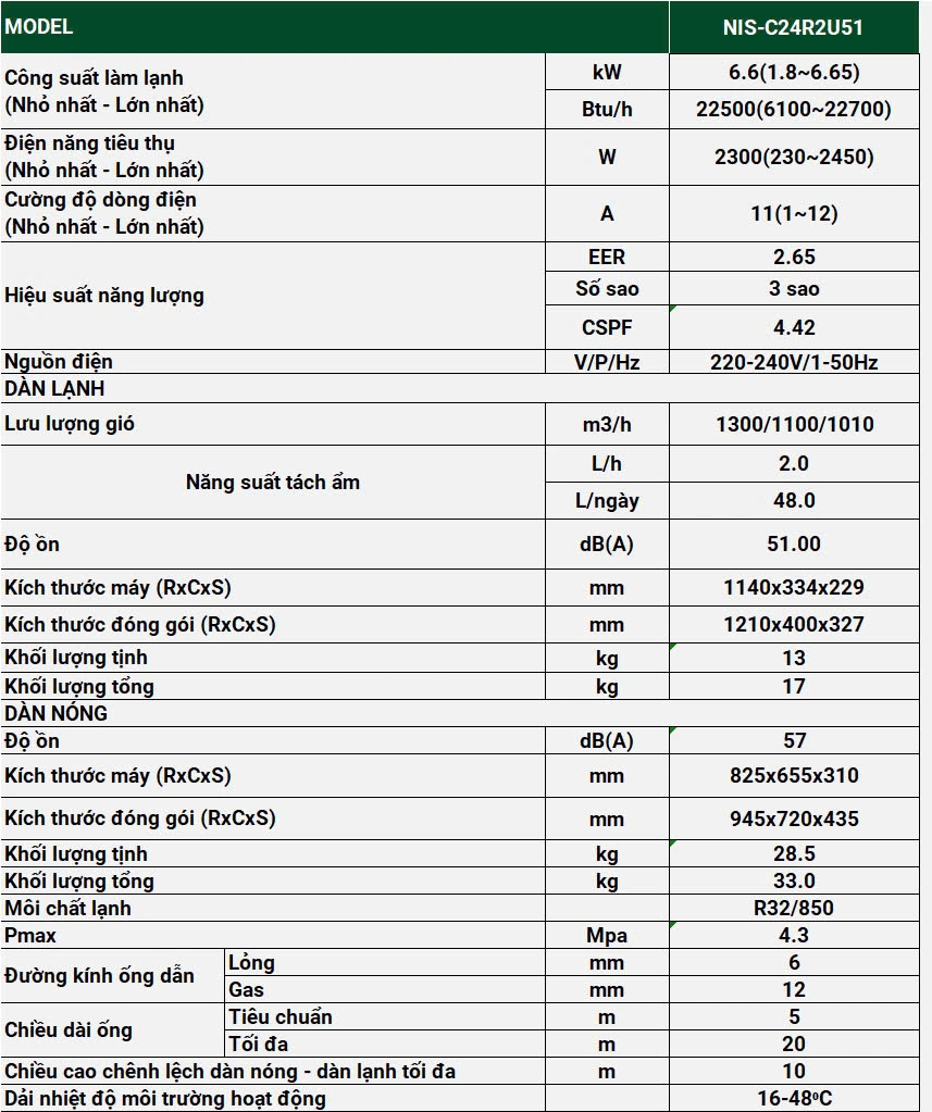 THÔNG SỐ KỸ THUẬT MÁY LẠNH NAGAKAWA INVERTER NIS-C24R2U51