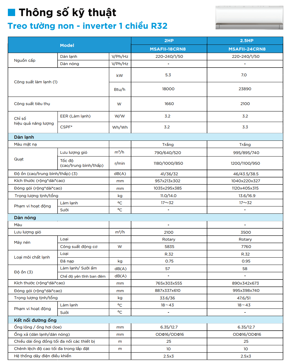 THÔNG SỐ KỸ THUẬT MÁY LẠNH TREO TƯỜNG NON INVERTER MIDEA MSAFII-24CRN8