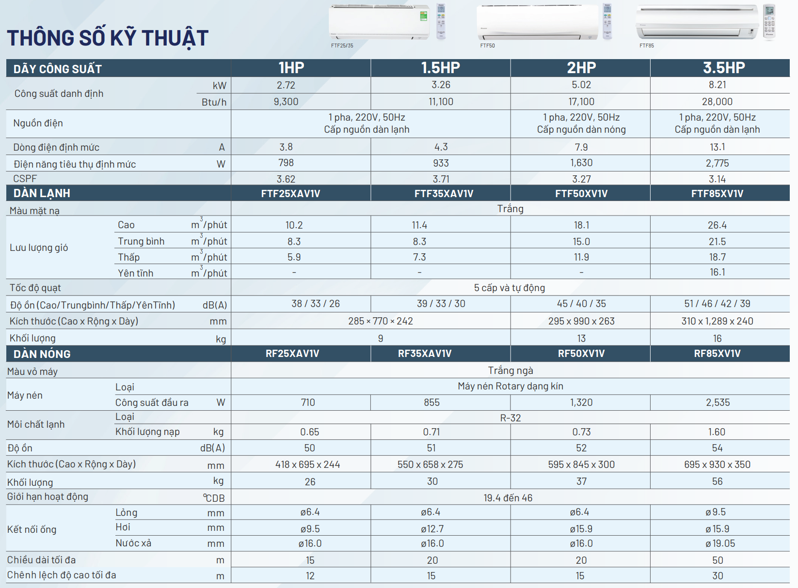 THÔNG SỐ KỸ THUẬT MÁY LẠNH TREO TƯỜNG NON INVERTER DAIKIN FTF85XV1V/RF85XV1V