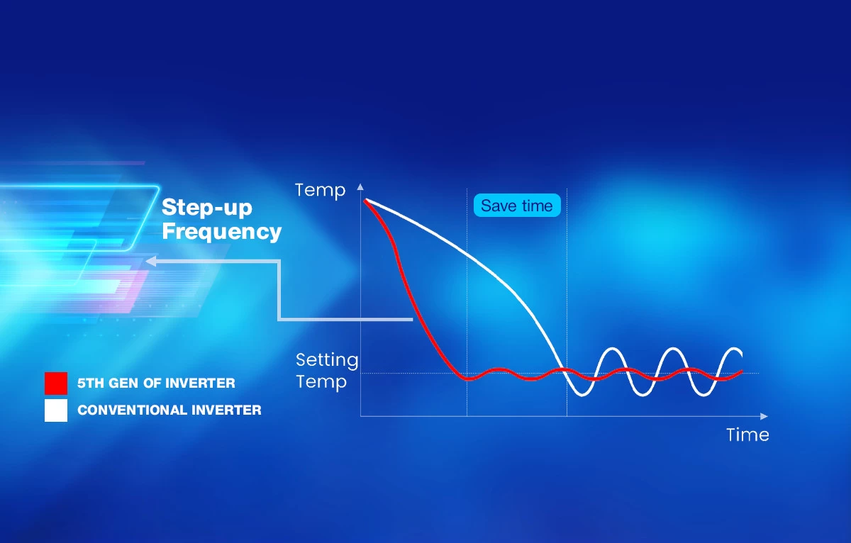 Với Step-up Frequency, tốc độ máy nén có thể "nhảy bậc" chính xác và mượt mà thay vì phải lần lượt chuyển đổi qua từng bậc như trước. Do đó, tốc độ khởi động ở cả hai chiều làm mát và sưởi ấm đều được điều chỉnh nhanh chóng hơn kể từ lúc máy bắt đầu vận hành. Bên cạnh đó, công nghệ biến tần mới còn thu nhỏ biên độ dao động nhằm kiểm soát nhiệt độ chặt chẽ hơn, căn phòng giờ đây không chỉ sớm đạt đến mức lý tưởng, mà còn duy trì ổn định trạng thái ấy cho người dùng.