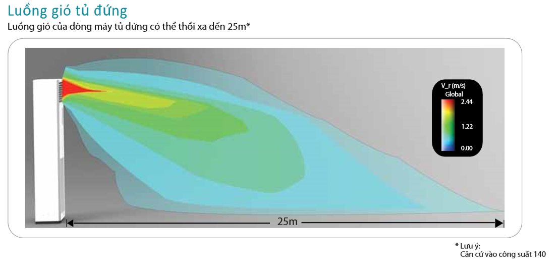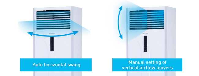 Thiết bị này sử dụng thanh hướng dòng xoay ngang tự động để tạo luồng khí thoải mái giúp làm mát mọi góc của căn phòng. Cánh thẳng đứng của nó được điều chỉnh thủ công để phù hợp với không gian nội thất khác nhau và phân vùng cũng như để tránh luồng không khí trực tiếp