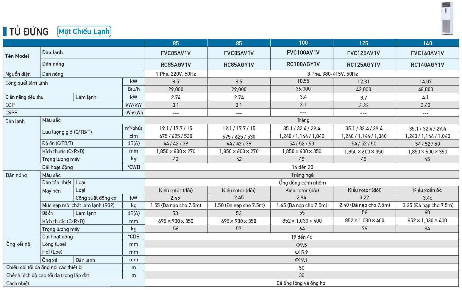 Thông số kỹ thuật Máy lạnh Tủ đứng Đặt sàn thổi trực tiếp Non Inverter Daikin FVC