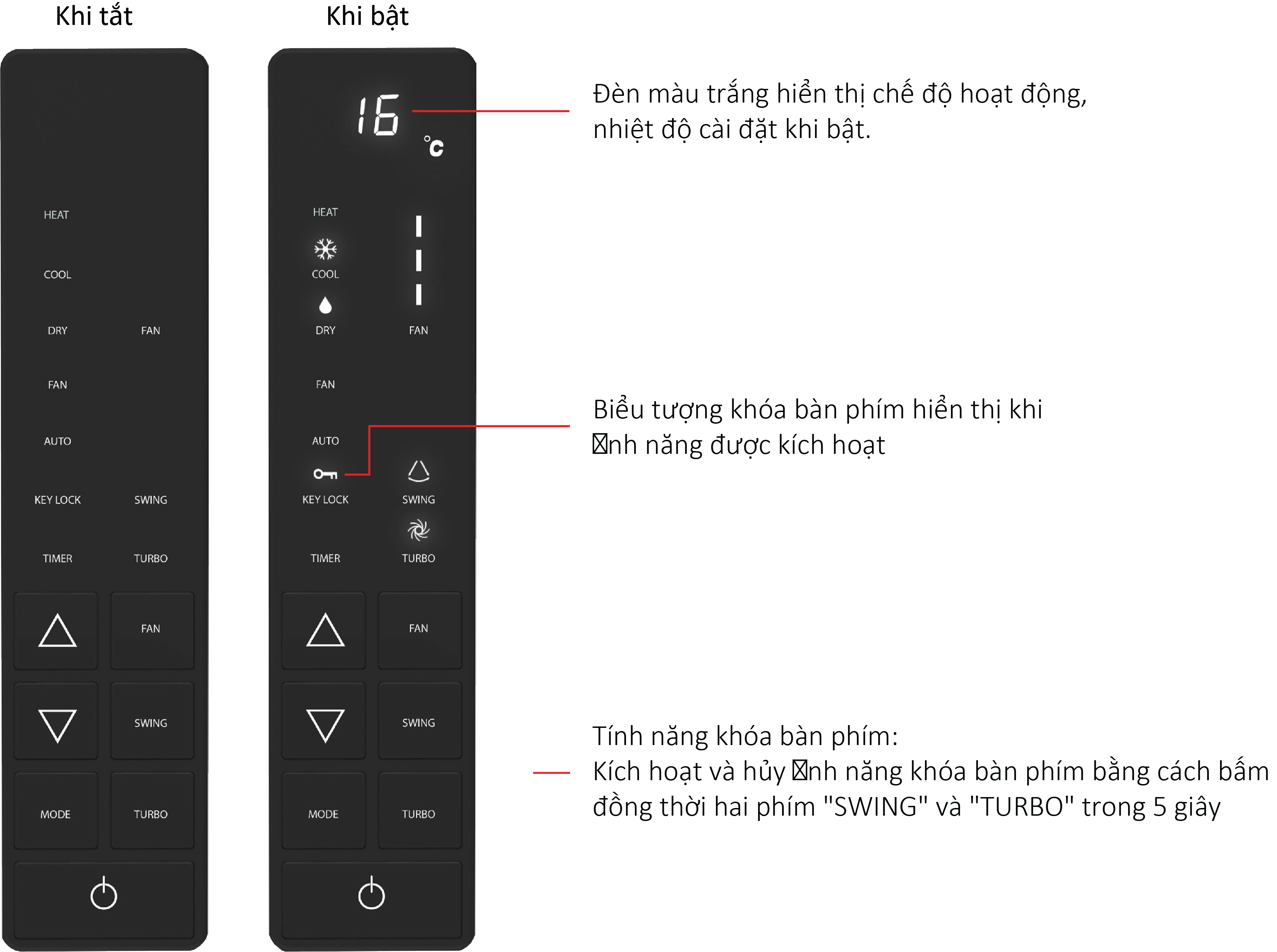 Bảng điều khiển màu đen thời trang với đèn LED màu trắng cho màn hình hiển thị rõ ràng sắc nét. Nút lớn dễ sử dụng . Khi BẬT máy, đèn hiển thị chế độ và nhiệt độ cài đặt