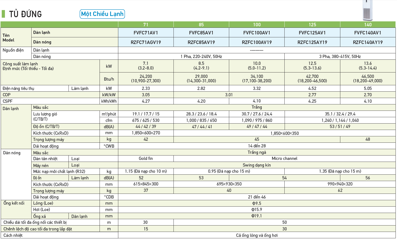 Thông số kỹ thuật Máy lạnh Tủ đứng Đặt sàn thổi trực tiếp Inverter Daikin FVFC