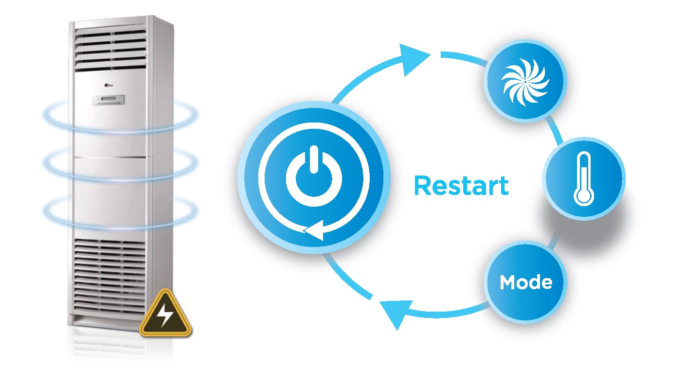 Máy lạnh tủ đứng MIDEA khi bị tắt ngoài mong muốn do sự cố điện, nguồn điện bị cắt đột ngột sẽ tự khởi động lại ngay khi được cấp nguồn trở lại đồng thời tự cài đặt lại theo đúng chức năng đã cài đặt trước đó.