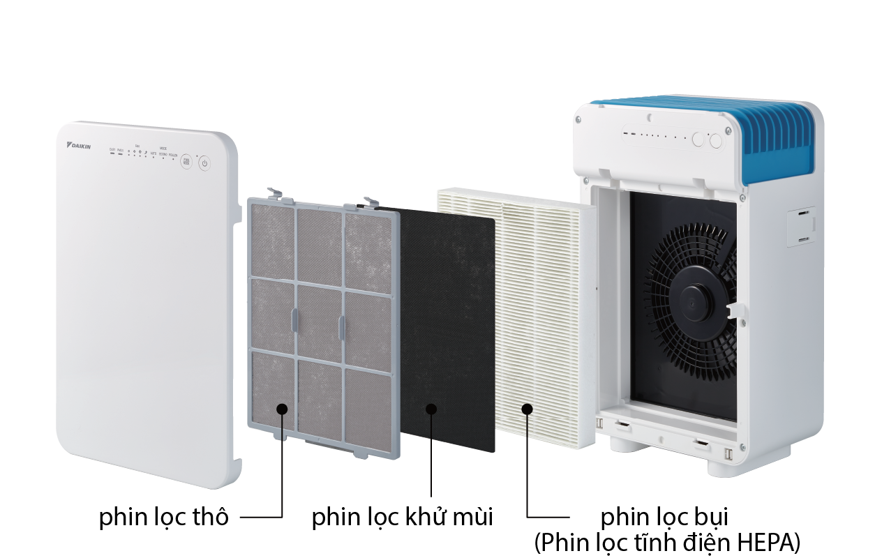 - Hệ thống phin lọc 3 cấp gồm phin lọc thô, phin lọc khử mùi và phin lọc bụi (Phin lọc tĩnh điện HEPA) đảm bảo lọc không khí nhanh chóng và triệt để