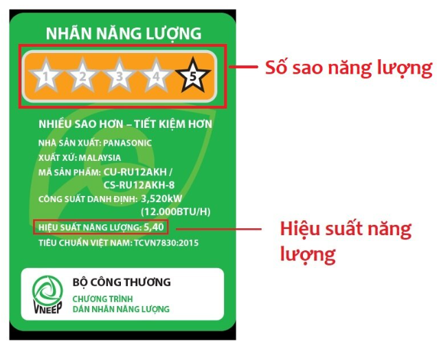 Nhãn năng lượng do bộ Công Thương quy định và chứng nhận. Nhãn năng lượng giúp người mua biết được các thông tin, chỉ số, cũng như khả năng tiết kiệm điện của các máy lạnh máy lạnh đang bán trên thị trường. Chỉ số quan trọng nhất trên nhãn năng lượng là số sao (từ 1 tới 5 sao). Số lượng sao càng nhiều, thiết bị càng tiết kiệm điện năng. Hầu hết máy lạnh hiện nay đều đạt từ 4 đến 5 sao. Trong đó, phần lớn máy lạnh sử dụng công nghệ máy nén biến tần Inverter đạt chứng nhận 5 sao.