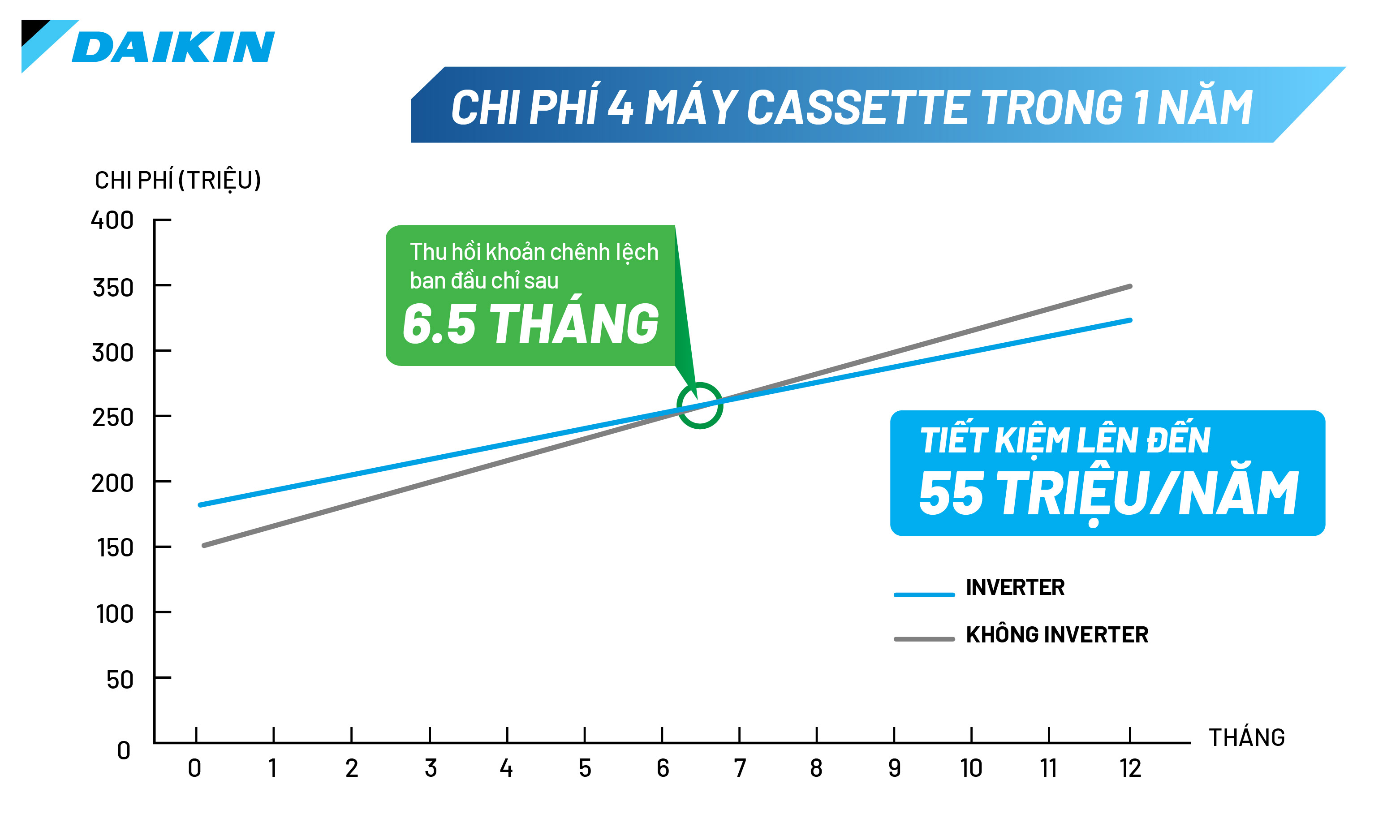 Mặc dù chi phí đầu tư cho máy Inverter cao hơn, nhưng với công năng tiết kiệm điện hiệu quả, người dùng sẽ thu hồi khoản tiền chênh lệch giá chỉ trong vòng chưa đến 7 tháng. Vì nhanh chóng bù lại mức chênh lệch ban đầu, tổng chi phí cuối cùng (bao gồm chi phí máy và điện năng sử dụng) sẽ thấp hơn hơn nhiều so với dòng máy không Inverter. Từ năm thứ 2, người dùng có thể tiết kiệm lên đến 55 triệu đồng mỗi năm. Nhờ đó, khi sử dụng lâu dài, ngoài việc thu hồi vốn nhanh, người dùng sẽ tiết kiệm được một khoản chi phí đáng kể.