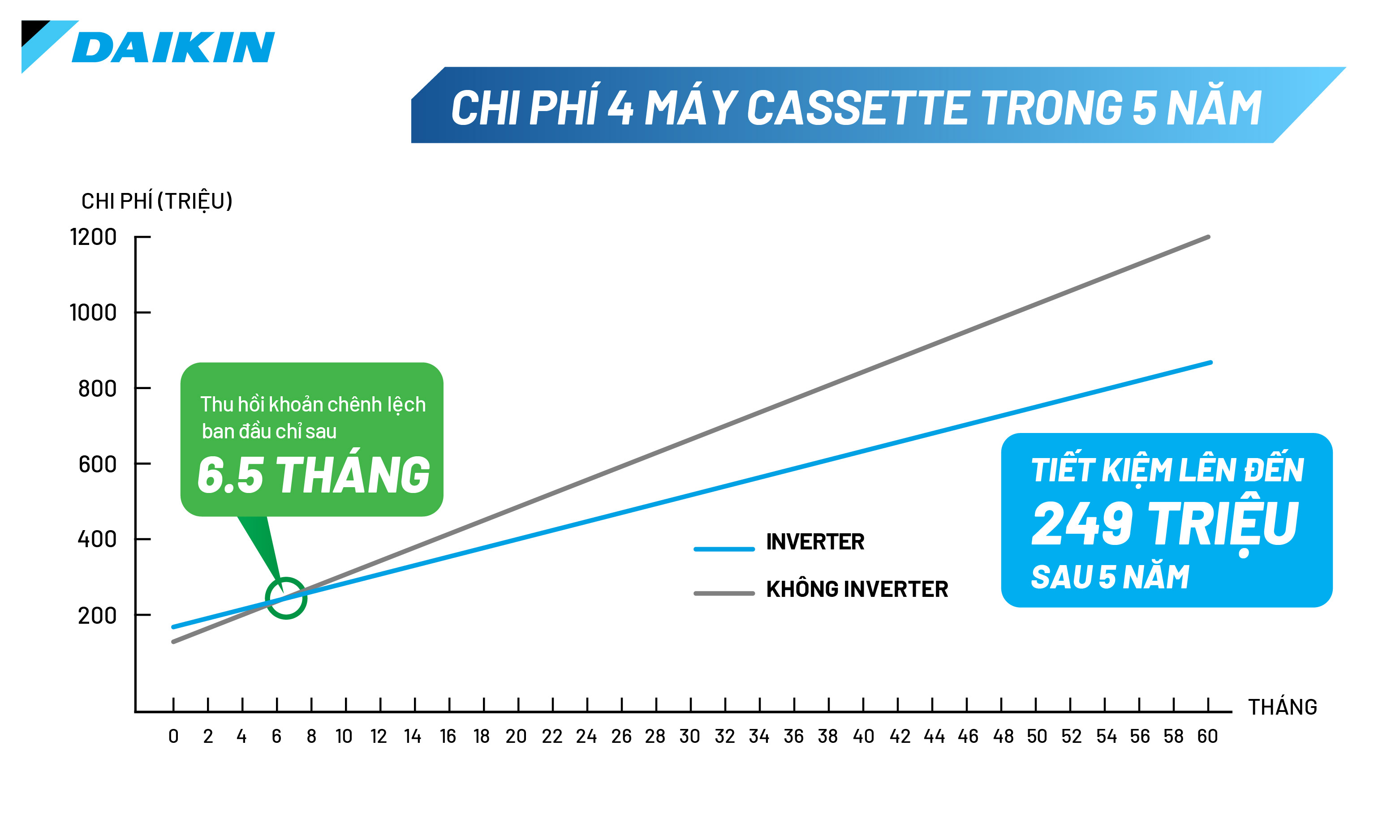 Sau 5 năm sử dụng, người dùng có thể tiết kiệm lên đến 249 triệu đồng. Đồng nghĩa với việc nếu như chuỗi cửa hàng (có điều kiện tương tự như thí nghiệm) sử dụng cassette Inverter của Daikin cho 100 cửa hàng, số tiền tiết kiệm được sau 5 năm sử dụng sẽ lên đến hơn 24 tỷ đồng.